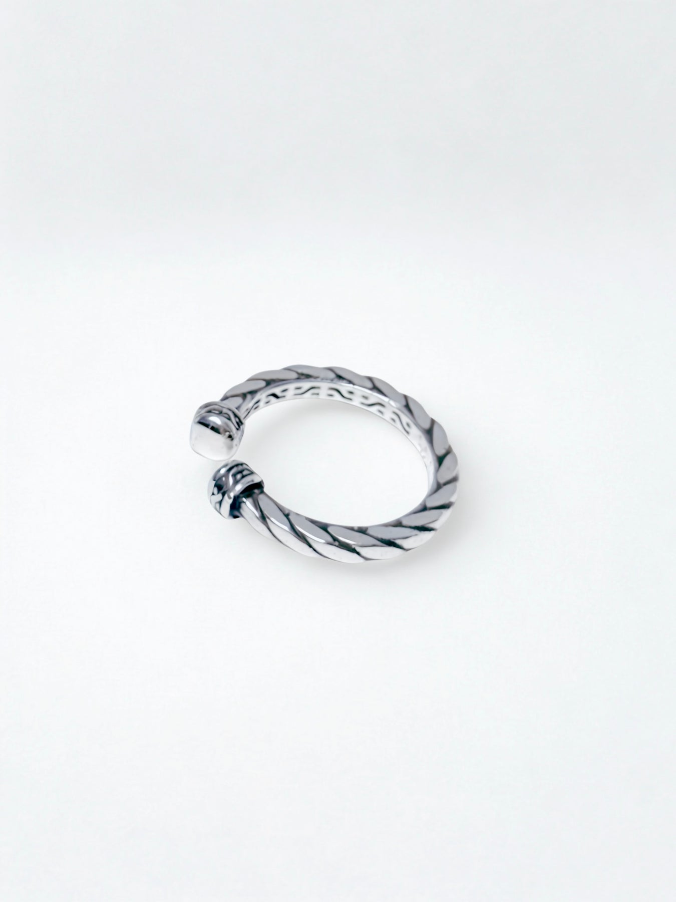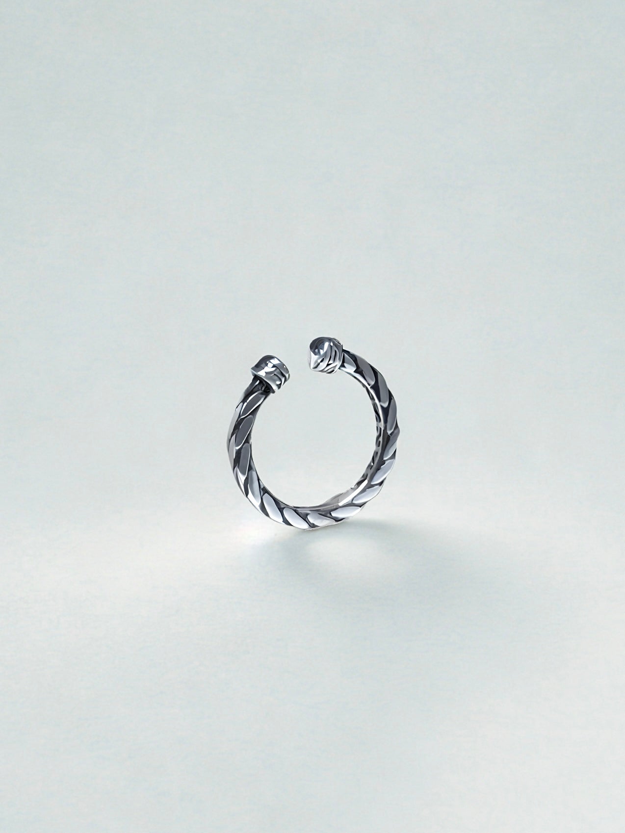 Silver twisted ring on a light gray background